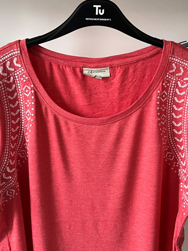 تیشرت زنانه AUTOGRAPH اورجینال و بسیار زیبا با رنگ سرخابی دور تیشرت با نخ کار شده و طرح رو بسیار منحصر بفرد کرده
